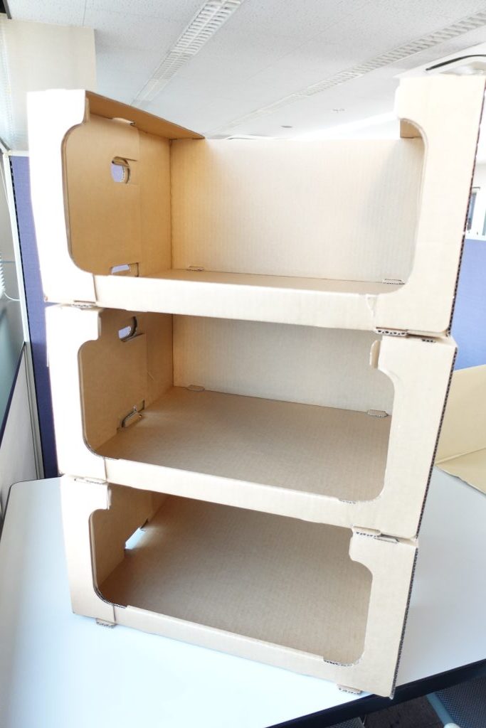 - 段ボール製の棚は持ち運びやすく、積み上げることも可能で安価に収納スペースを増やすことが出来ます。